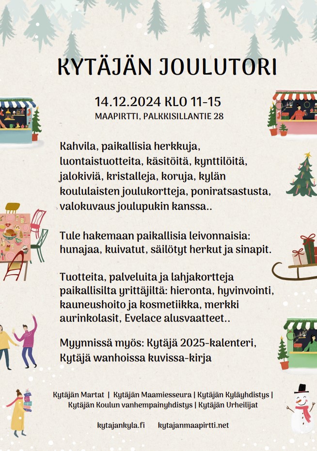 # ”Maapirtin työpajat”: Kytäjäläisiltä kysyttiin viime joulukuussa miten he haluavat käyttää Maapirttiä jatkossa. Pidettiin kaksi työpajaa (9.3. ja 6.4.) ja esiteltiin 21 alustavaa ideaa. Lauantaina 6.4. paikalla oli edustajat kaikista Kytäjän yhdistyksistä ja silloin valittiin toteutettaviksi sopivat . Seuraavaksi näistä ideoista ja niiden toteutuksesta keskustellaan yhdistysten hallituksissa. Kyläläisten on myös mahdollista toteuttaa omia ideoitaan. Niistä voi ilmoittaa esim. kytajanmaamiesseura@gmail.com