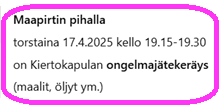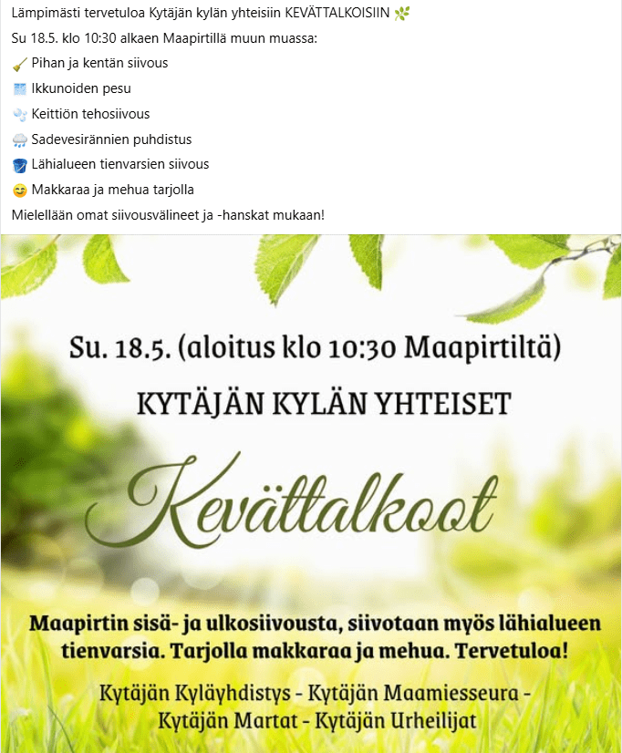Su:na 19.5. pidettiin Kylän kevättalkoot. Mukana oli 18 ahkeraa vapaaehtoista. Suuri kiitos kaikille osallistujille, teidän ansiostanne saatiin paljon aikaan! ![]()